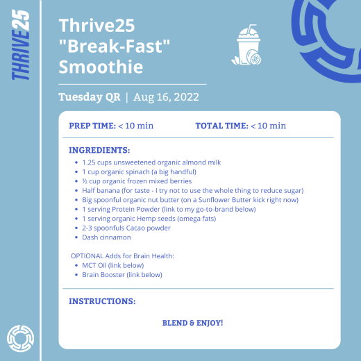 Every Tuesday we’ll include a QR (quick recipe) - today we’re sharing my personal break-fast smoothie!