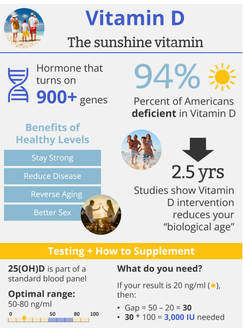 The sunshine vitamin - more benefits than we can state here. Make sure you keep your levels in the optimal range for optimal health! (And get outside in the sun! ☀️).