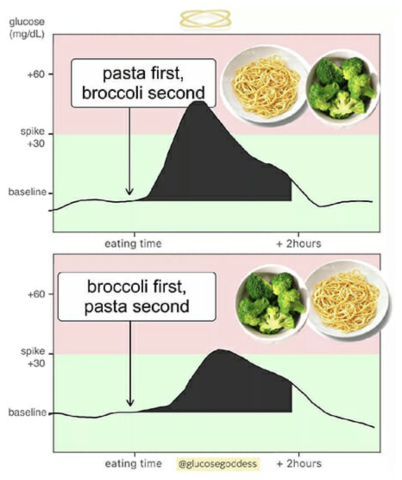 At the same time, eating the fiber first, will also lower the spike in blood sugar during the main course. NOTE: these spikes are what we want to avoid for metabolic health problems!