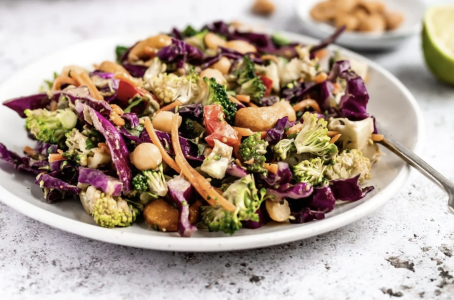 Enjoy a Thai-inspired broccoli salad, bursting with nutrients from colorful veggies like broccoli, bell peppers, carrots and red cabbage. This delight features protein-rich chickpeas and cashews, and a spicy ginger-peanut dressing. It's not just a flavor fiesta - it's a health boost in a bowl!
