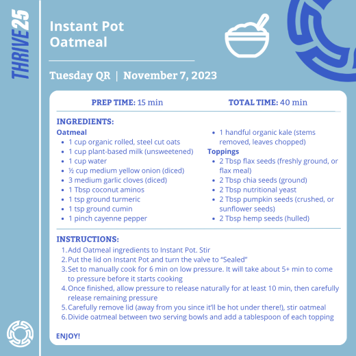 Boost your immunity with a breakfast designed to combat colds and flu. Packed with disease-fighting ingredients like turmeric, kale, and garlic, this meal is rich in antioxidants and anti-inflammatory properties. Nutrient-dense seeds and oats provide essential omega-3’s and fiber, fortifying health from the start of your day. Enjoy!