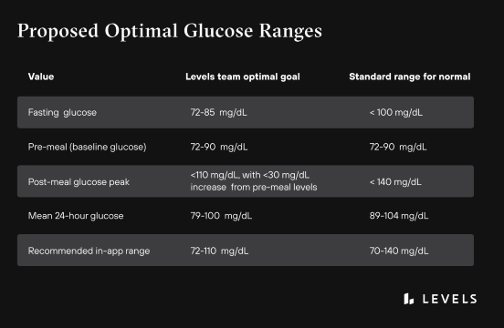 Here’s what Levels Health provides as guidelines for optimal blood glucose levels: