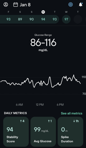 4. Careful What You Drink - I mostly drink water and green tea. But I’d been tired lately and started drinking Celsius after my workouts. It doesn’t have sugar (only stevia and sucralose), but it did spike my glucose. I want to learn why - but in the meantime I’m sticking with green tea.