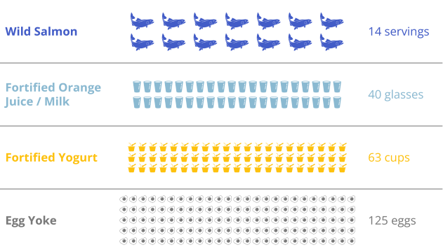 Vitamin D just isn’t in that many foods. The average daily suggested amount is about 5,000 IU. Check out how much you'd have to eat everyday to get there without sunshine or a supplement: