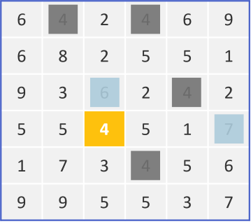 In this 6x6 grid, you need to use logic to the find nine unique number (1 to 9) so that each row and column has a sum of 9 or less. It’s kinda like sudoku, but with more distractions. The 4 highlighted in yellow is given.