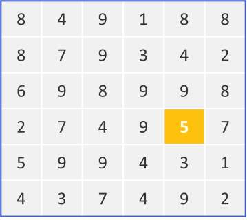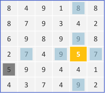 In this 6x6 grid, you need to use logic to find the nine unique numbers (1 to 9) so that each row and column has a sum of 9 or less. It’s kinda like sudoku, but with more distractions. The 5 highlighted in yellow is given.