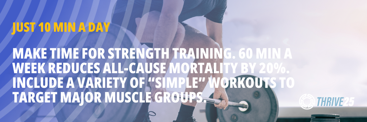 A meta-analysis study found that just 30-60 min of strength training a week can reduce all-cause mortality by 20%. (Source)