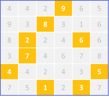 In this 6x6 grid, you need to use logic to find nine unique numbers (1 to 9) so that each row and column has a sum of 9 or less. It’s kinda like sudoku, but with more distractions. The 8 highlighted in yellow is given.