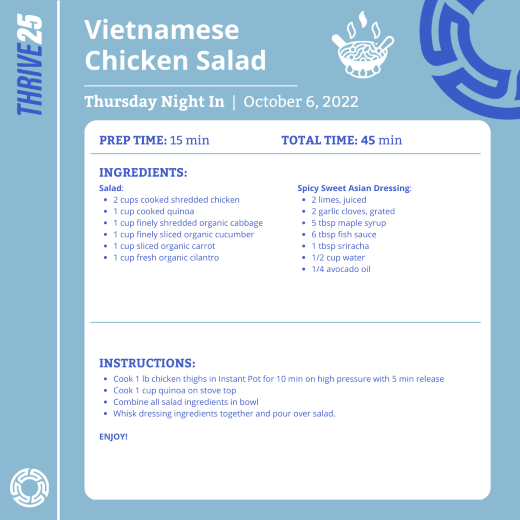 Pro Tip: We made a couple pounds of shredded chicken to use for multiple meals - no worries if you make the chicken ahead of time. Can serve cold or warm it up to go on top of the salad.