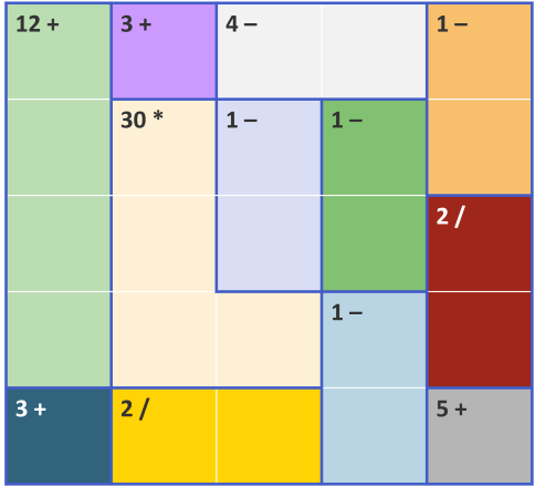Each bold-outlined group (with same color) must equate the result with the numerical operation - addition (+), subtraction (-), multiplication (*) and division (/)