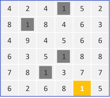 Kyudoku is a 6x6 grid where you need to use logic to find nine unique numbers (1 to 9) so that each row and column has a sum of 9 or less. The 1 highlighted in yellow is given.
