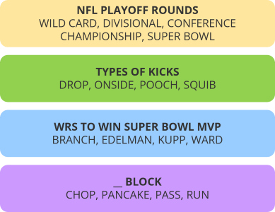 Remember the rules - create 4 groups of 4 words based on some common theme from the list of 16 words below: