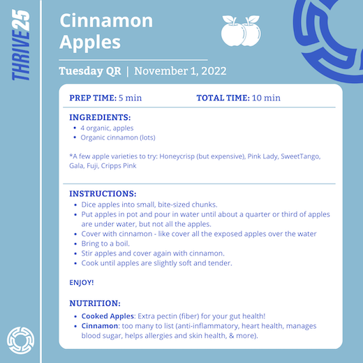 Got a real simple recipe for the first day of November - just boil some apples with cinnamon. They taste even better than raw apples with peanut butter and have way more health benefits, plus kids love 'em!